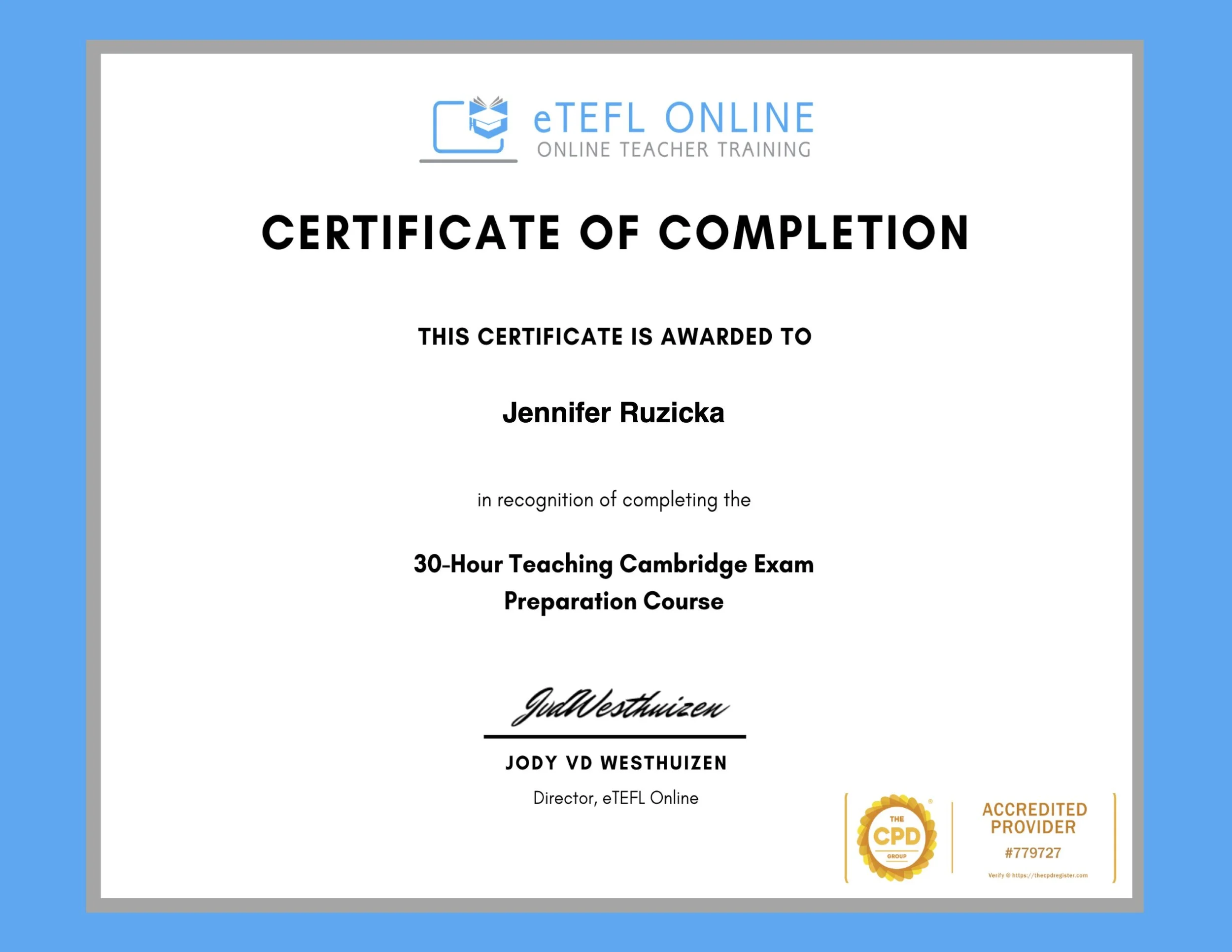 In addition to my Ofqual-regulated Level 5 TEFL certification, I hold specialized 30-hour certifications in Cambridge, IELTS, and TOEFL exam preparation, as well as in Teaching English Online, Tutoring English, and Grammar Fundamentals.